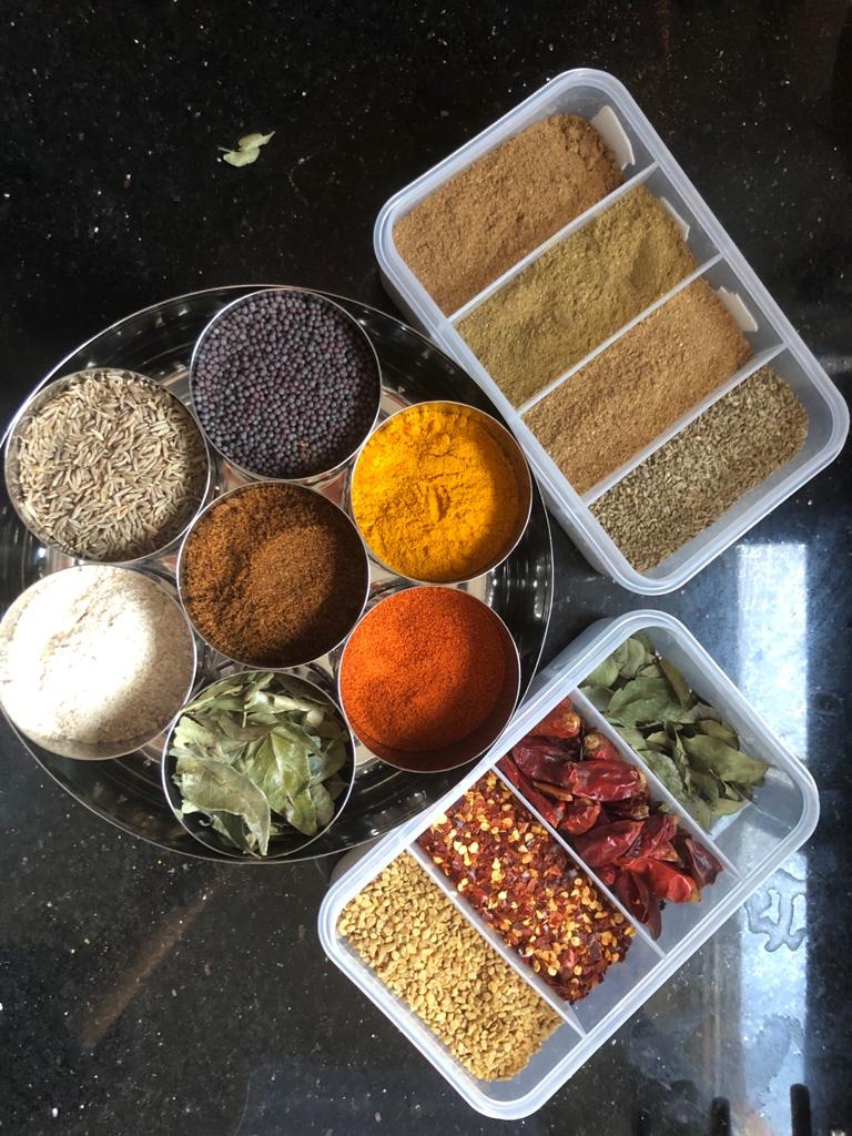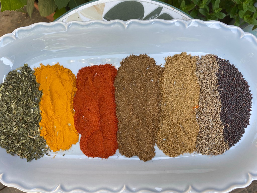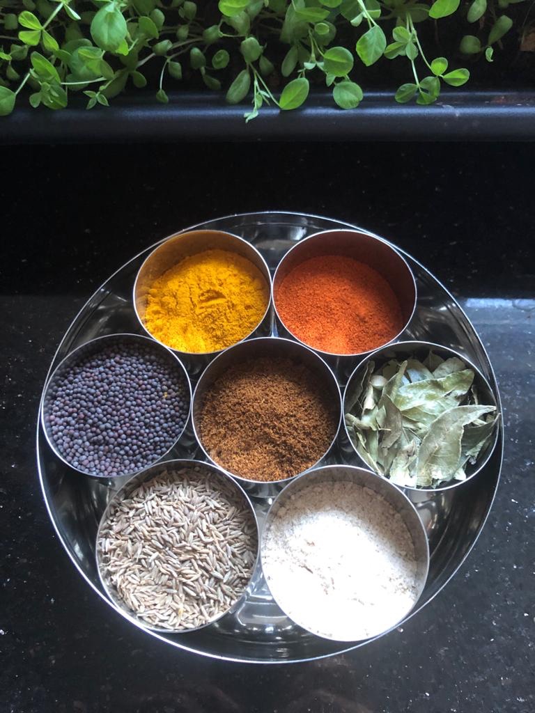 Left to right : Kasthuri Methi (fenugreek), Haldi (Turmeric), Mirch (Chilli Powder), Garam Masala, Dhaniya (Coriander Powder), Jeera (Cumin Seeds), Rai (Mustard Seeds).