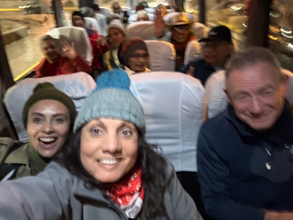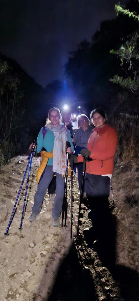 The walk to our next lodge was long and dark in the end . We were on narrow unsteady paths. Most of us had our night lights, some didn’t as it wasn’t supposed to be this long! We all supported each other and sang and chatted our way back. I have no photographs of this period as spent most of my time shouting ,”tuck in” “stay left” , being Roz’s light or playing music. Rekha had been carried down like a baby in a papoose. It was sight to behold and it all happened so fast! She got back at 7.30pm. We got back at 10pm!😥