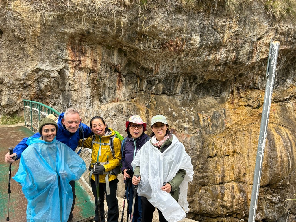 The only time on the whole trip I think when we needed our ponchos ! See the minerals leeching from the rocks behind .