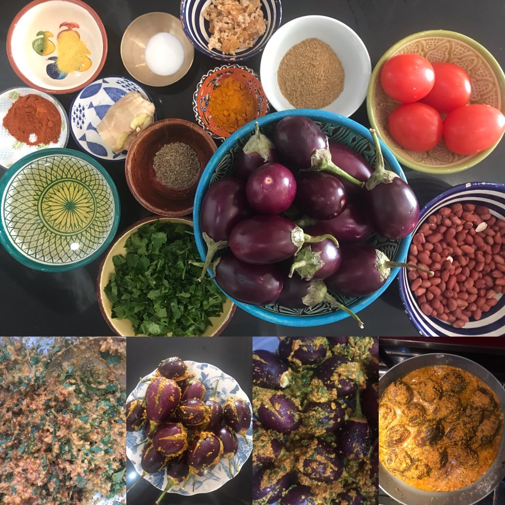 Then it was the turn of the ā€˜not just one small aubergine.’ Look at the number of ingredients and the amazing colours: how could anyone not enjoy doing this! I suggest clearing of diary as you cut and fill the little buggers. It tasted fab but not for anyone with a nut allergy.